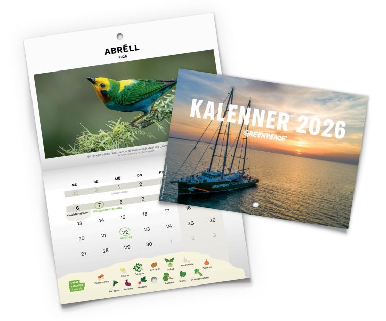 Soutenez Greenpeace et, en remerciement, vous recevrez prochainement votre calendrier 2026 en luxembourgeois pour afficher votre engagement à nos côtés. Cette offre est valable pour tout don effectué avant le 31 décembre 2025 supérieur ou égal à 20€, dans la limite des stocks disponibles.
